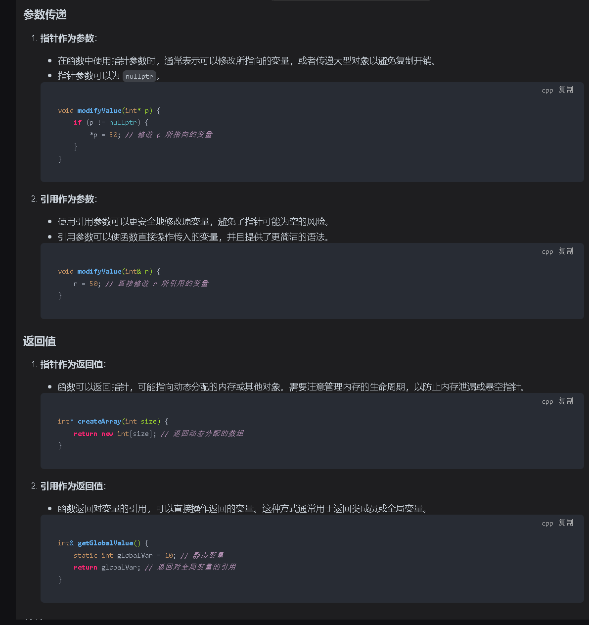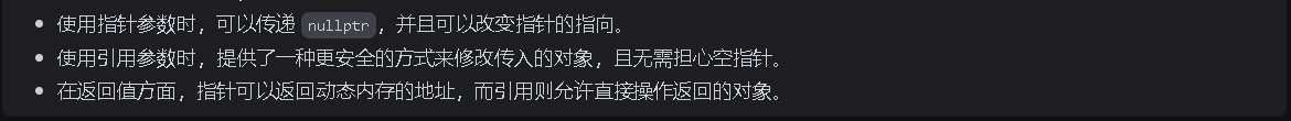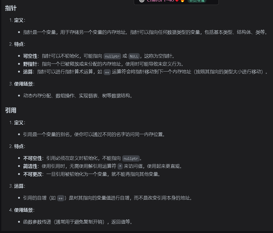 什么是指针?存储一个变量的地址。什么是引用?给一个变量起别名。引用可以直接操作数据,不用解指针,指针在用法上还需要注意空指针和野指针。引用不能为空,而指针在定义的时候可以不初始化,指针++是加到下一个地址,引用++是数值++,底层汇编上引用是用指针实现的,VS汇编代码,除此之外指针和引用可以做参数和返回值,代表的意思也不相同。